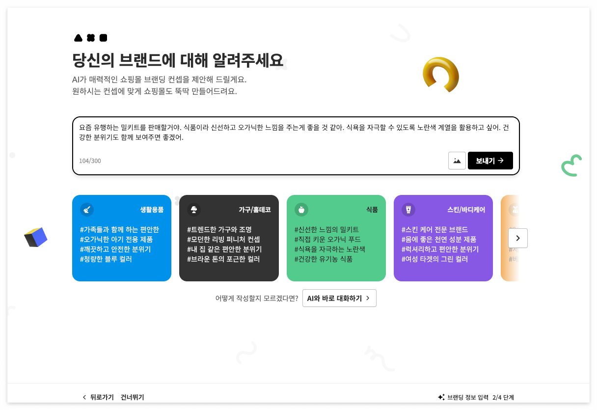 오랜만에 카페24쇼핑몰 신규 계정을 만들어서 신규 쇼핑몰을 만들고 있었다. 오우.. ai로 사이트를 만들어 준다고?세상 너무 좋아졌다. 레퍼런스 사진도 첨부해서 만들 수 있고,URL을 넣어도 된다구? 대박 설레는 마음으로 바로 제작을 해보았다.이때까지만 해도 관련해서 블로그 쓸 생각에 가슴이 웅장했음 ai가 내가 적은 대로 뚝딱 사이트를 보여줬다.게다가 컨셉도 3개로.. 생각보다 멀쩡한 디자인이 나왔다.살짝 워드프레스 무료 디자인 같지만, 그래도 처음 사업을 시작하는 사업자 입장에서 충분해 보였다. 이렇게 이쁘게 나오면 카페 24 유료 스킨 업체들은 어떡하냐 생각하고 [적용하기]를 눌렀다. 뭐지? 방금 내가 본 사이트는 엄청 인터렉티브 하고 멋졌는데갑자기 카페24 기본 스킨이 보였다. 뭐지? ..